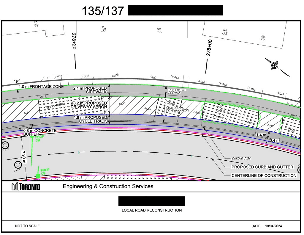 Developed 25 consolidated sheets outlining bike lane installations and nearby sidewalk/driveway changes for consultation use.