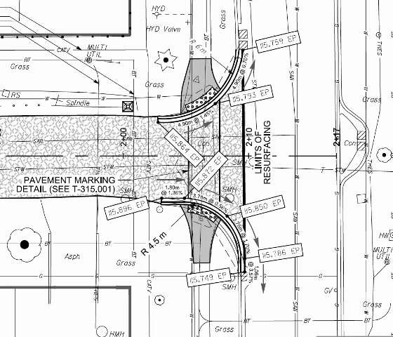 Designed corner reconstruction improvements to enhance pedestrian safety and accessibility at a local intersection in Etobicoke. The curb radii were reduced to calm vehicle turns and shorten crossing distances. Landing pads were widened and fitted with tactile walking surface indicators (TWSIs) to meet AODA standards and improve accessibility for all users. The design also optimized grades and resurfacing limits to ensure smooth transitions and proper drainage.