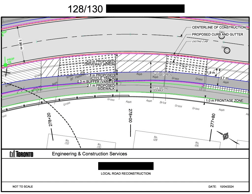 For Project North York A, I created 25 detailed sheets showing bike lane installations and their impact on the surrounding landscape, including sidewalk and driveway apron modifications. Originally, 100 sheets were required, but I reduced the scope to 25 by grouping similar configurations for side-by-side houses. These sheets were used for a Councillor presentation and later reused for a public consultation. While driveway aprons are city property, residents often express concerns, but we strive to be helpful and guide them in understanding our vision for safer and more accessible roads. The presentation focused on the precise dimensions and adjustments needed to integrate bike lanes while maintaining accessibility and minimizing disruption for residents.