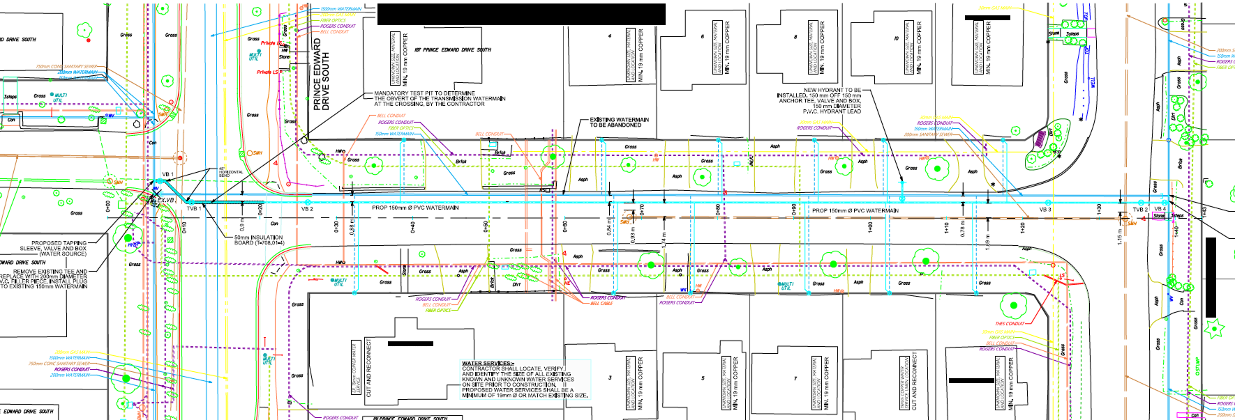 Designed a new water main installation that successfully navigated around an existing sewer line, achieving 0.5m vertical clearance between the pipes while maintaining adequate 1.65m burial depth for freeze protection.